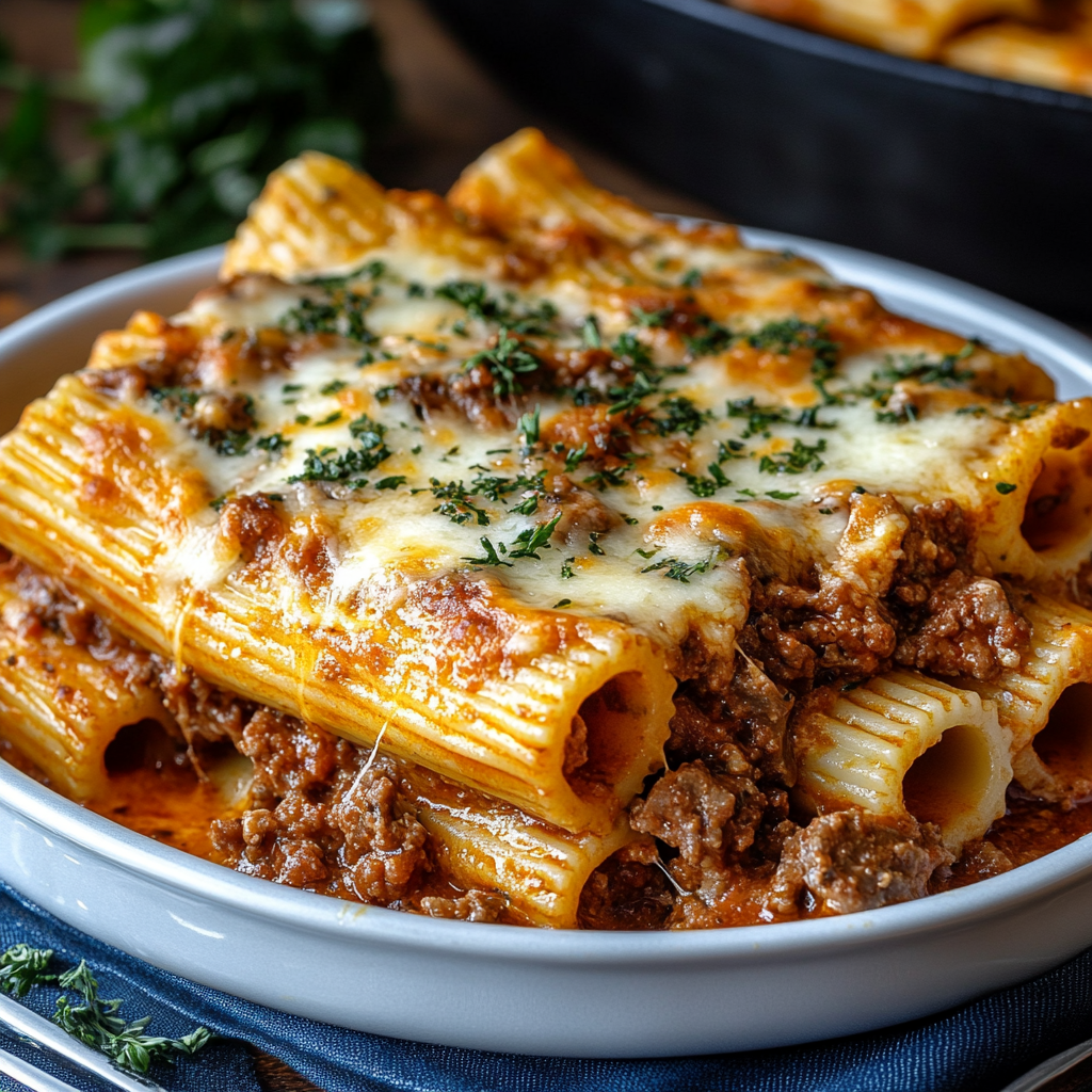 This cozy baked pasta dish features rigatoni filled and coated with a rich, slow-simmered beef ragu, then topped with melted mozzarella for a bubbly, golden finish. It’s hearty, comforting, and perfect for family dinners or make-ahead meals.