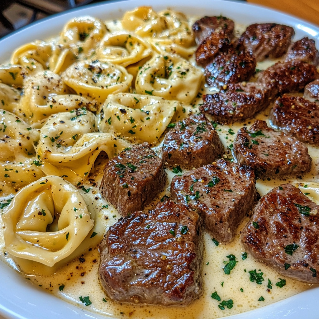 Cheesy Garlic Herb Alfredo with Steak and Tortellini