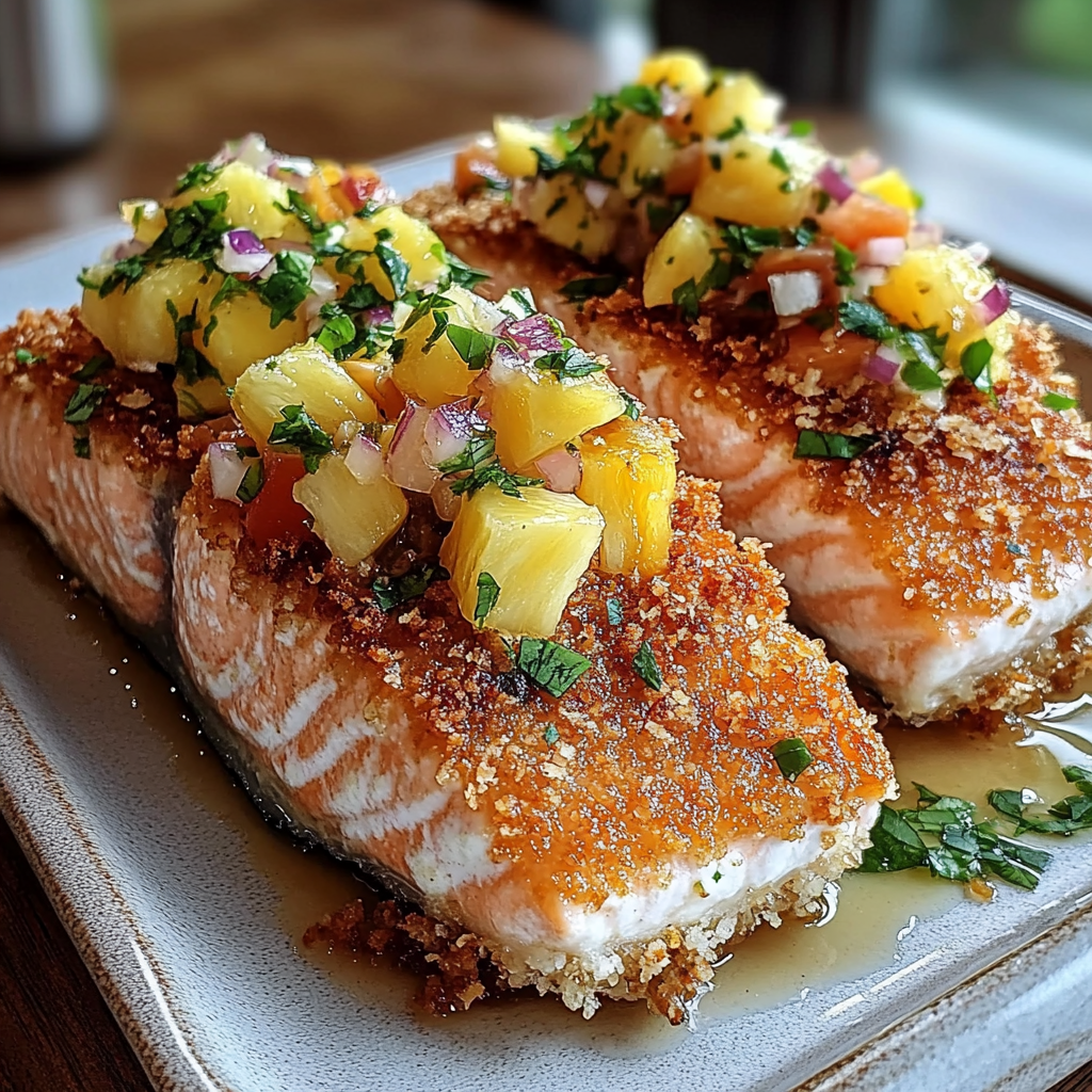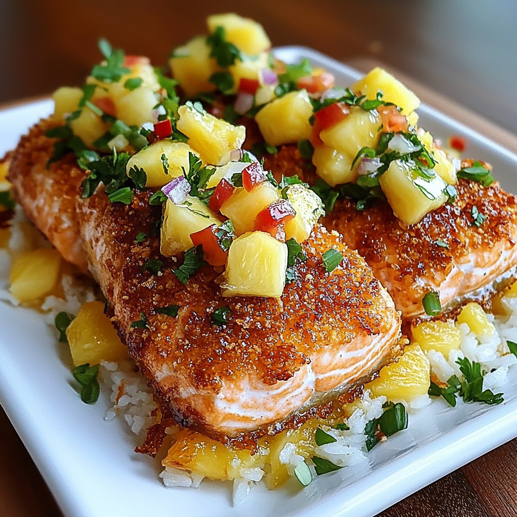 Delight in the tropical flavors of Coconut Crusted Salmon with Pineapple Salsa, an exquisite dish that brings the taste of the islands to your table. This recipe features succulent salmon fillets coated in a crispy coconut and breadcrumb crust, paired perfectly with a vibrant pineapple salsa. Whether you’re hosting a dinner party or enjoying a weeknight meal, this dish is quick to prepare and bursting with flavor.