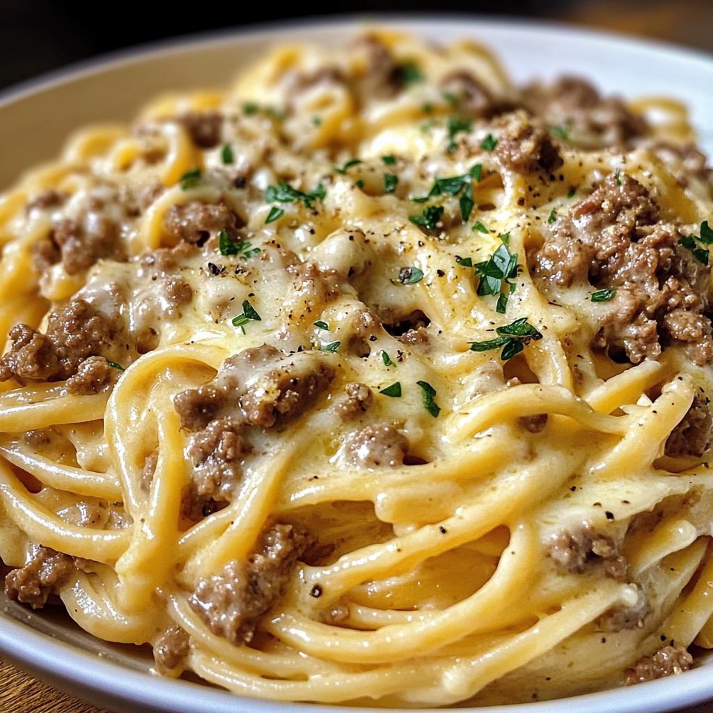 Creamy Four-Cheese Ground Beef Linguine is the ultimate comfort dish that promises to please your palate with its rich, savory flavors and creamy textures. This delightful pasta combines perfectly cooked linguine with seasoned ground beef, all enveloped in a luscious four-cheese sauce that will leave everyone wanting more. Quick and easy to prepare, this recipe is ideal for busy weeknights or special family gatherings. Customize it by adding your favorite vegetables or substituting ground beef with turkey or lamb for a variation that suits your taste. Serve it garnished with fresh parsley for an elegant touch!