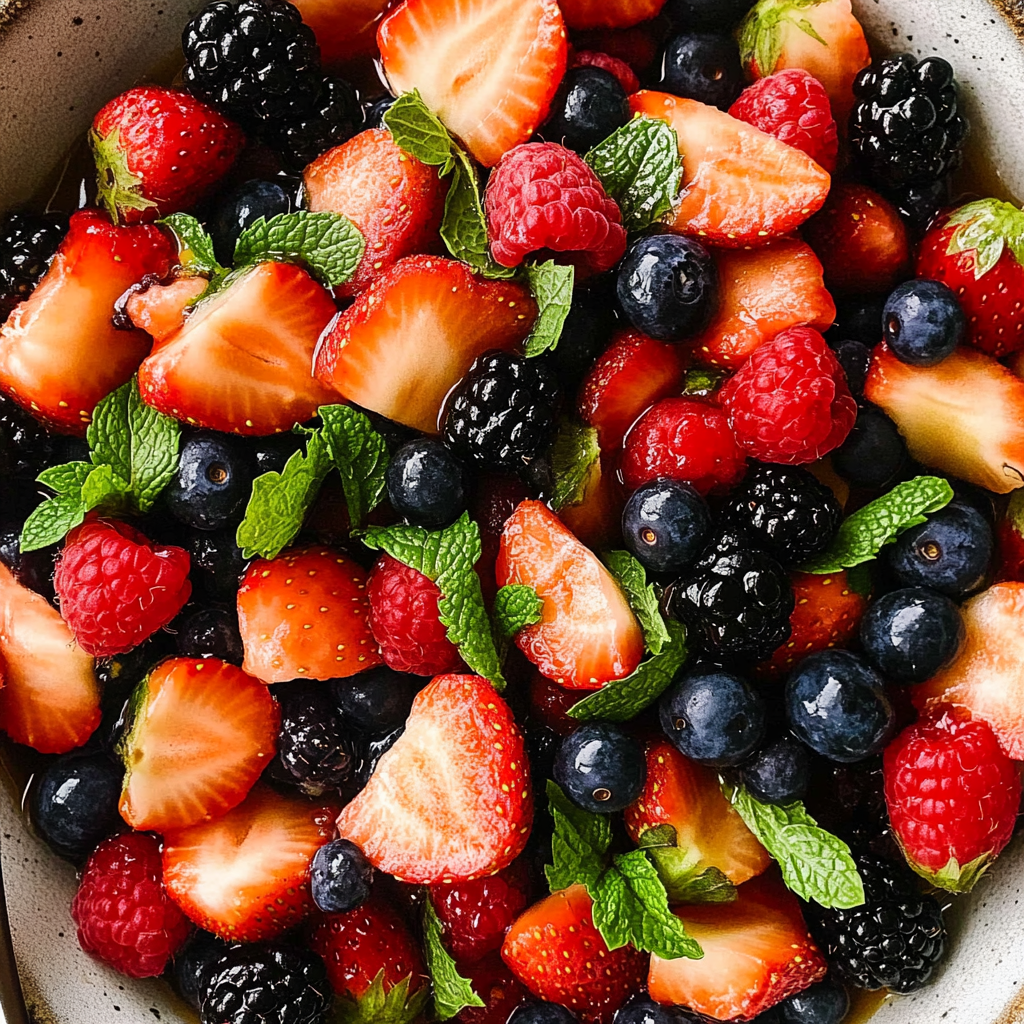 1. In a large mixing bowl, combine the strawberries, blackberries, blueberries, raspberries, and chopped mint.