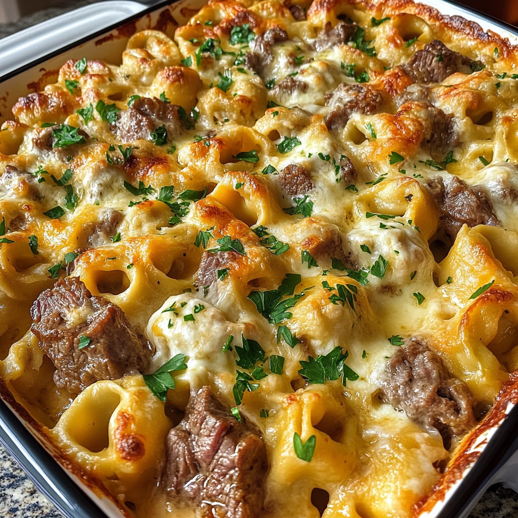 Golden Cheese Steak Tortellini Casserole is a creamy and hearty dish made with steak, cheese tortellini, and a rich cheese sauce, baked until bubbly.