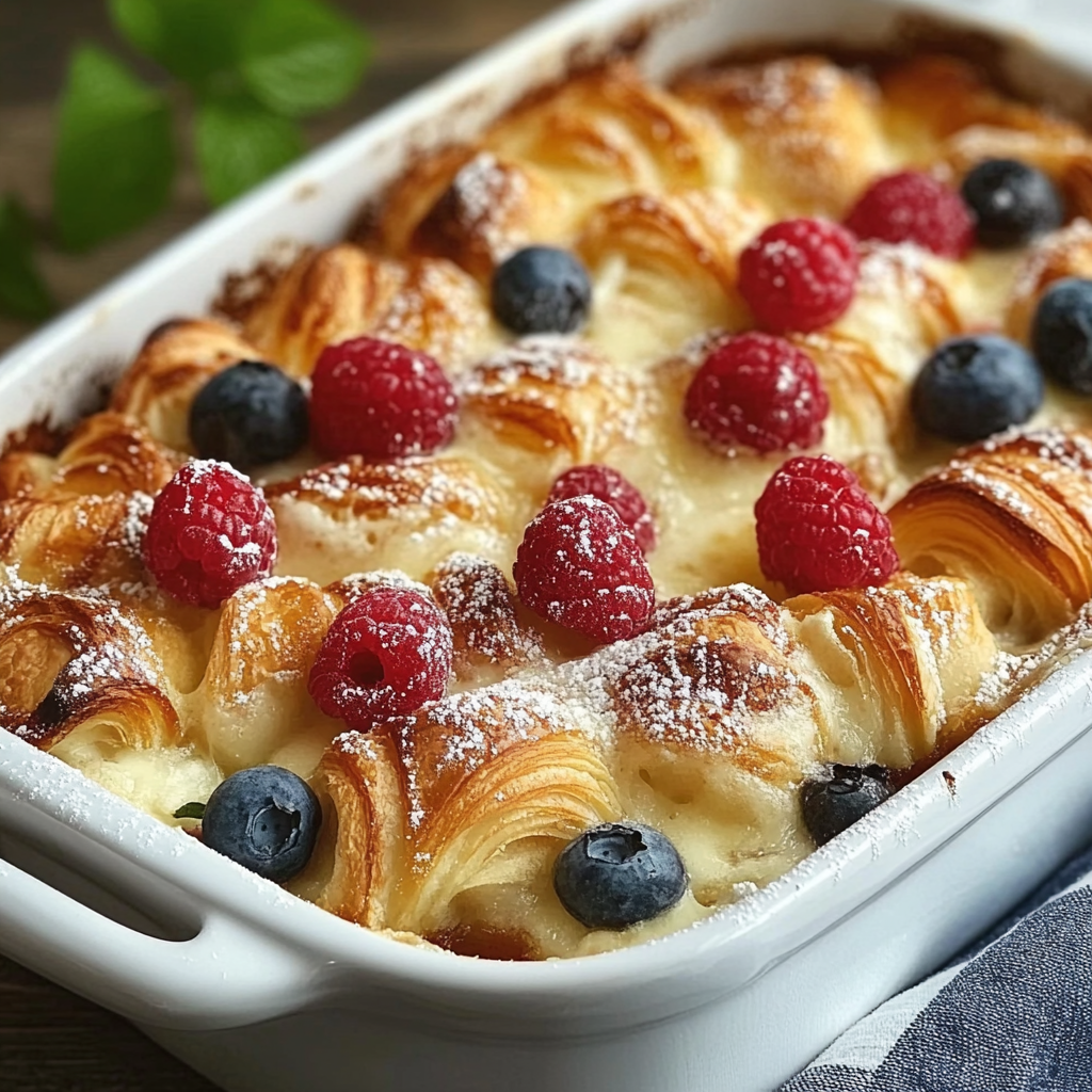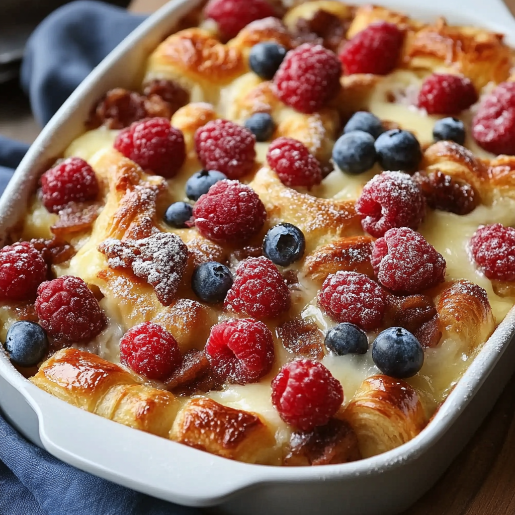 A Sweet Breakfast Casserole (with Croissants) is a delicious dish made by layering cubed croissants with a creamy custard and berries, then baked until golden.