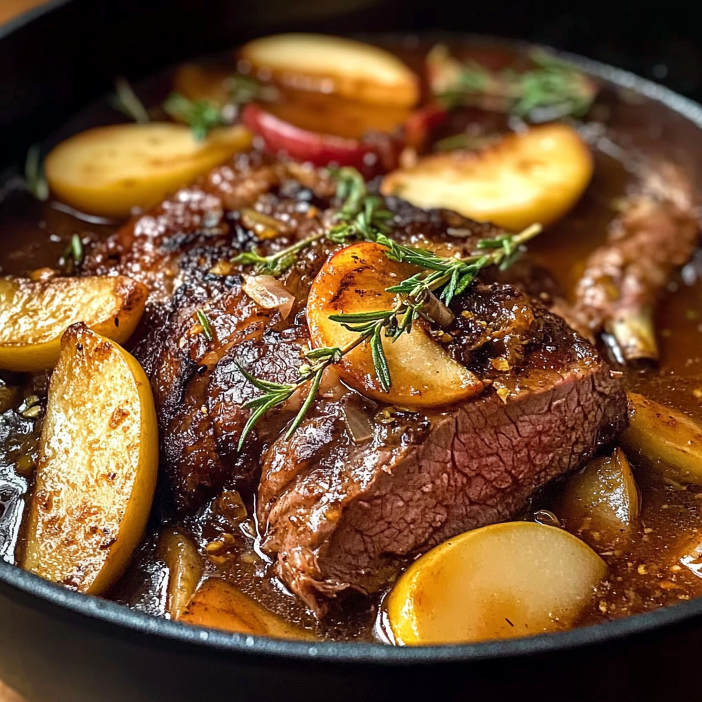 Tasty Apple Cider Braised beef Shoulder is a comforting dish made by slowly cooking beef shoulder with apple cider and herbs, resulting in tender meat infused with sweet and savory flavors.