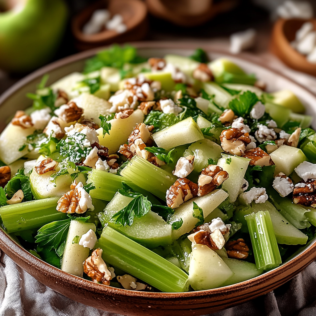 This salad showcases simple yet rich flavors through its combination of crunchy celery, toasted walnuts, and a tangy dressing.