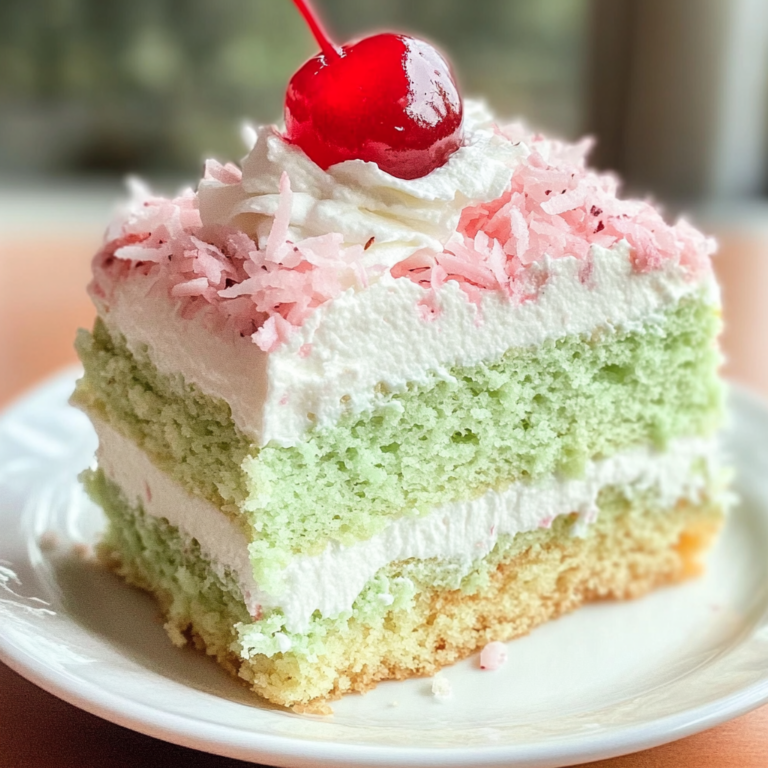 Watergate Cake is a delightful retro dessert that captures the essence of nostalgia with its vibrant green color and unique pistachio flavor. This easy-to-make cake combines a moist, fluffy texture with a creamy frosting, making it a perfect choice for birthdays, potlucks, or just an indulgent treat at home. Topped with sweetened coconut and adorned with maraschino cherries, each slice promises a burst of flavor that will impress guests of all ages. Whether enjoyed as a standalone dessert or paired with coffee, Watergate Cake is sure to become a favorite in your recipe collection.